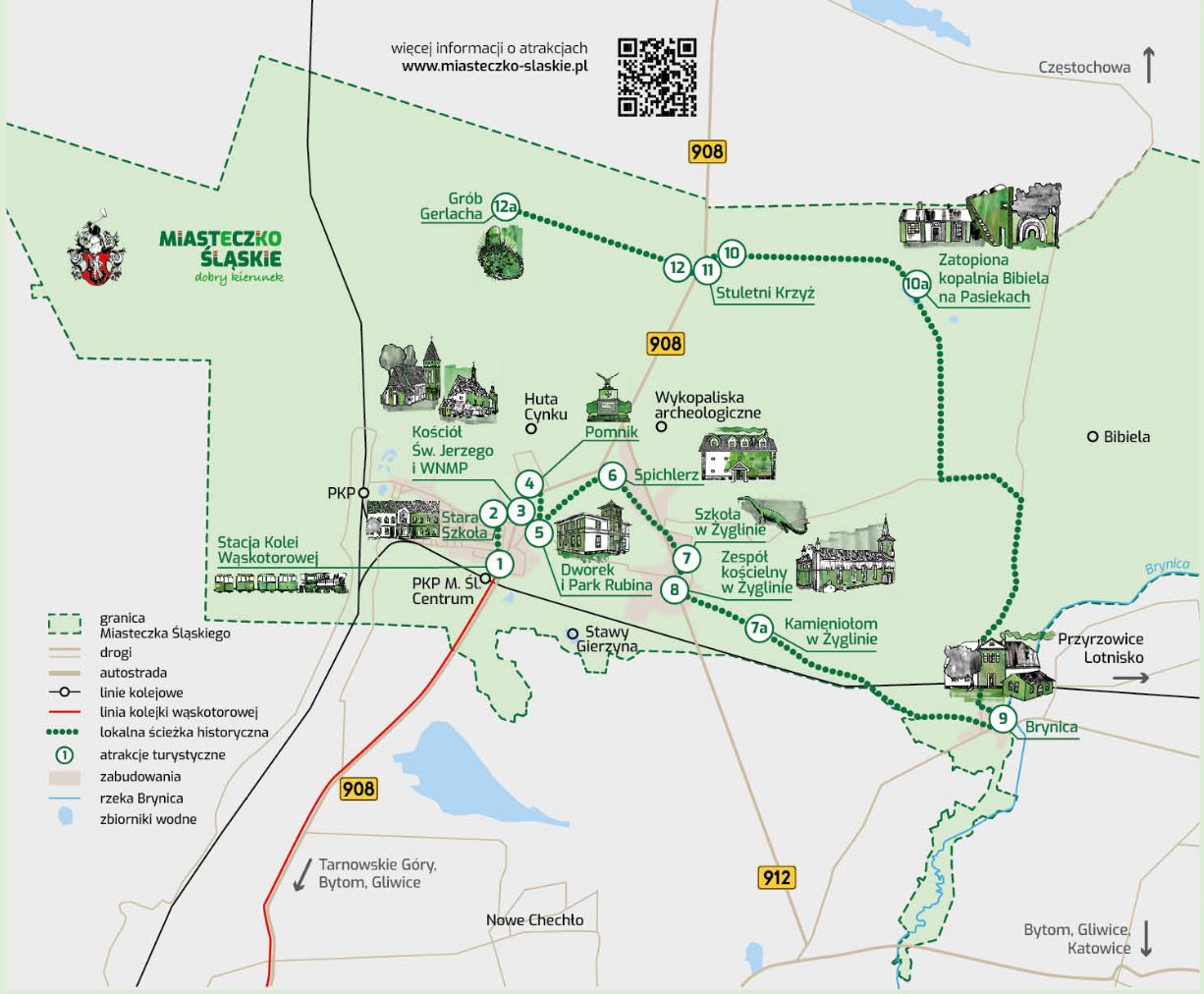 W ramach Projektu oznakowano 12 interesujących miejsc oraz postawiono 4 tablice z mapami całej ścieżki, a w Parku Rubina powstał tematyczny mural. Lokalna artystka Tokkinika - Dominika Hajduk idealnie oddała zamysł ścieżki i zaprojektowała mural ukazujący zabytki tego miasta, ale z ukrytymi „smaczkami” – nawiązaniami do legend i podań zebranych w Miasteczkowskich berach i legendach Antoniego Famuły. Tablice i ulotki wyróżniają się artystycznymi grafikami także wykonanymi przez Tokkinikę oraz barwnymi literackimi opisami. Uzupełnieniem turystycznym projektu są stojaki rowerowe oraz kosze uliczne do selektywnej zbiórki odpadów. Mural bardzo pozytywnie wpłynął na estetykę Parku Rubina – miejsca spotkań i rekreacji mieszkańców oraz licznych imprez sportowych i kulturalnych. Dodatkowo umieszczone na nim logo herbu miasta sprawiły, że jest chętnie fotografowanym elementem przez mieszkańców i turystów. Zapraszamy do odkrywania Miasteczka Śląskiego, jego zabytków, historii i legend podczas wycieczek po Lokalnej Ścieżce Historycznej Miasteczka Śląskiego!